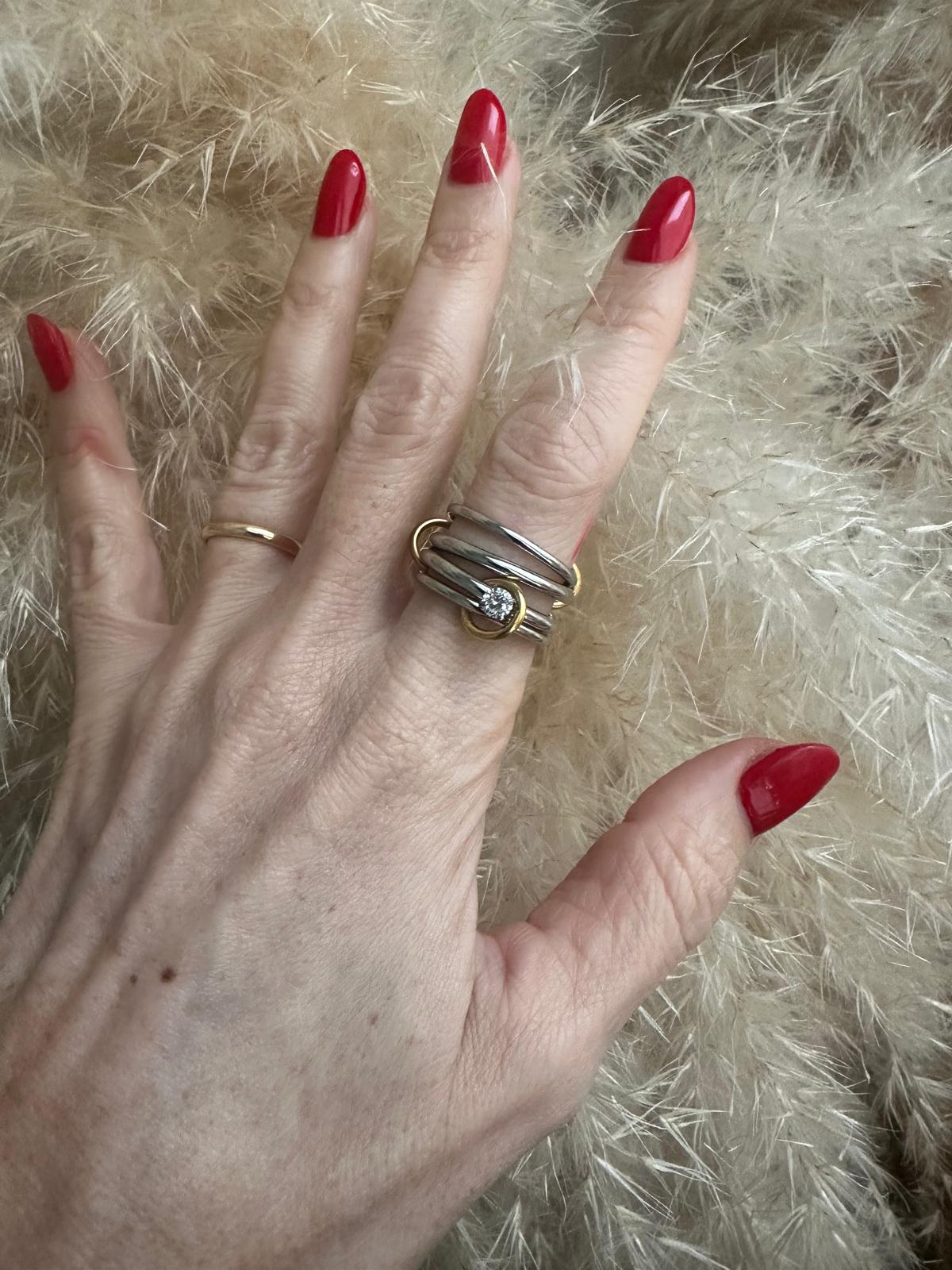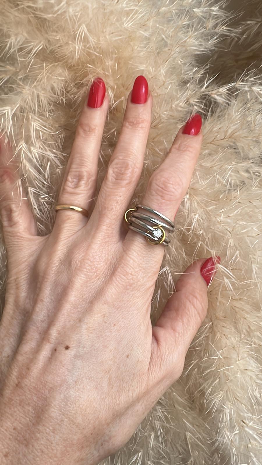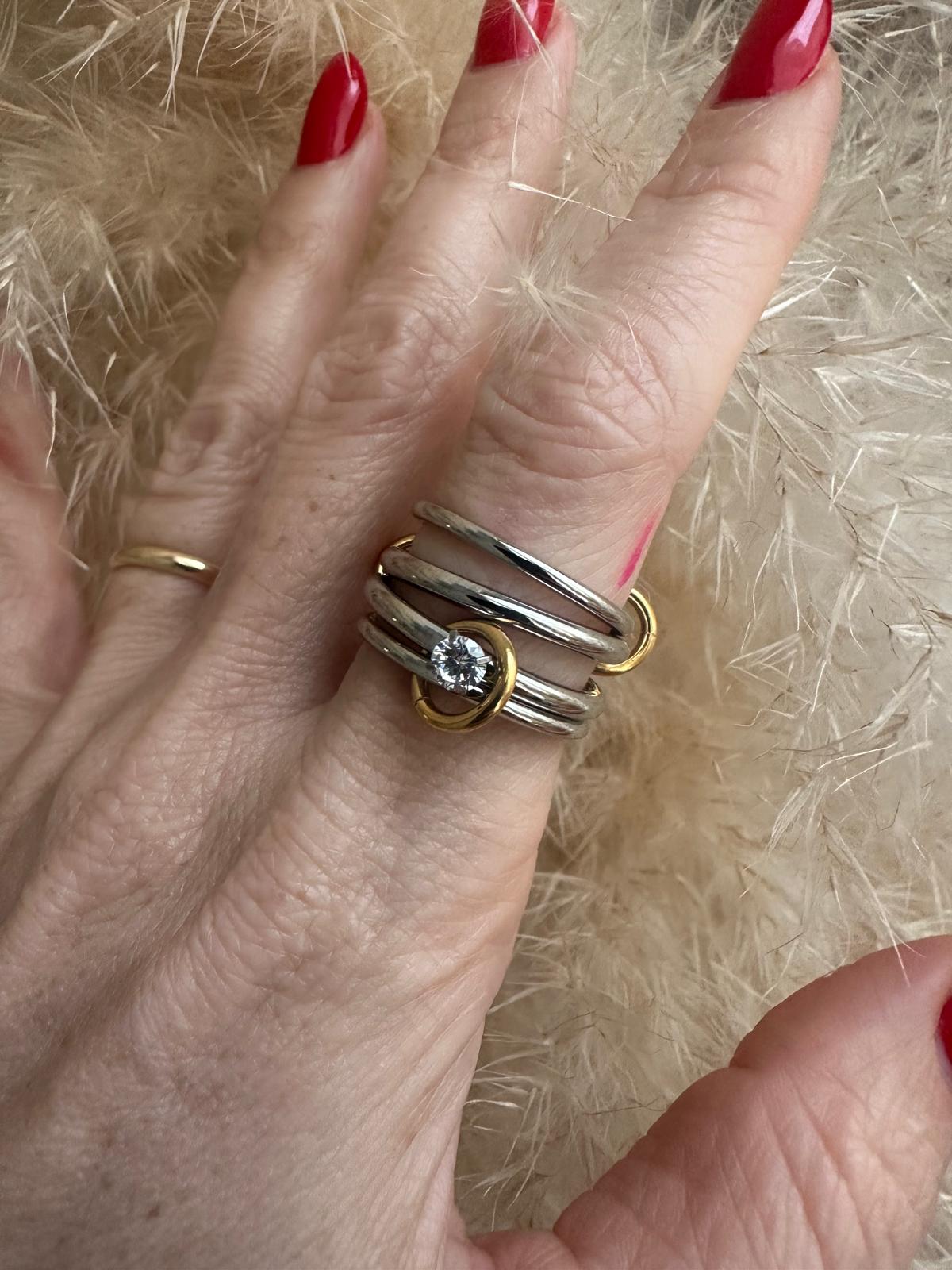 L'anello è composto da 4 fedine silver di cui una con zircone unite tra loro da dei piccoli anellini placcati oro 18K. Si può indossare in vari modi in base a come si distribuiscono le fedine sulle dita